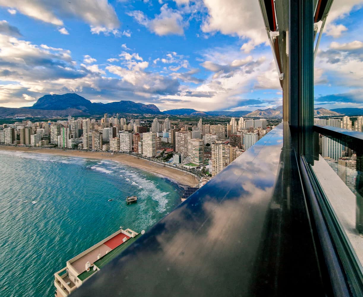 The balcony on the 24th floor is a jewel suspended above Benidorm, offering a spectacular view of the Mediterranean Sea, the beach and the town.